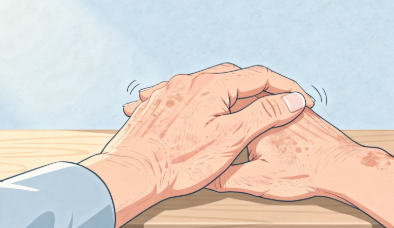 가장 대표적인 증상입니다. 가만히 TV를 보거나 휴식을 취할 때 손이나 발이 떨립니다. 특징적인 것은 무엇을 잡거나 움직이면 떨림이 일시적으로 멈춘다는 점입니다. 엄지와 검지를 비비는 듯한 '환약을 굴리는 듯한 동작'이 관찰되기도 합니다.